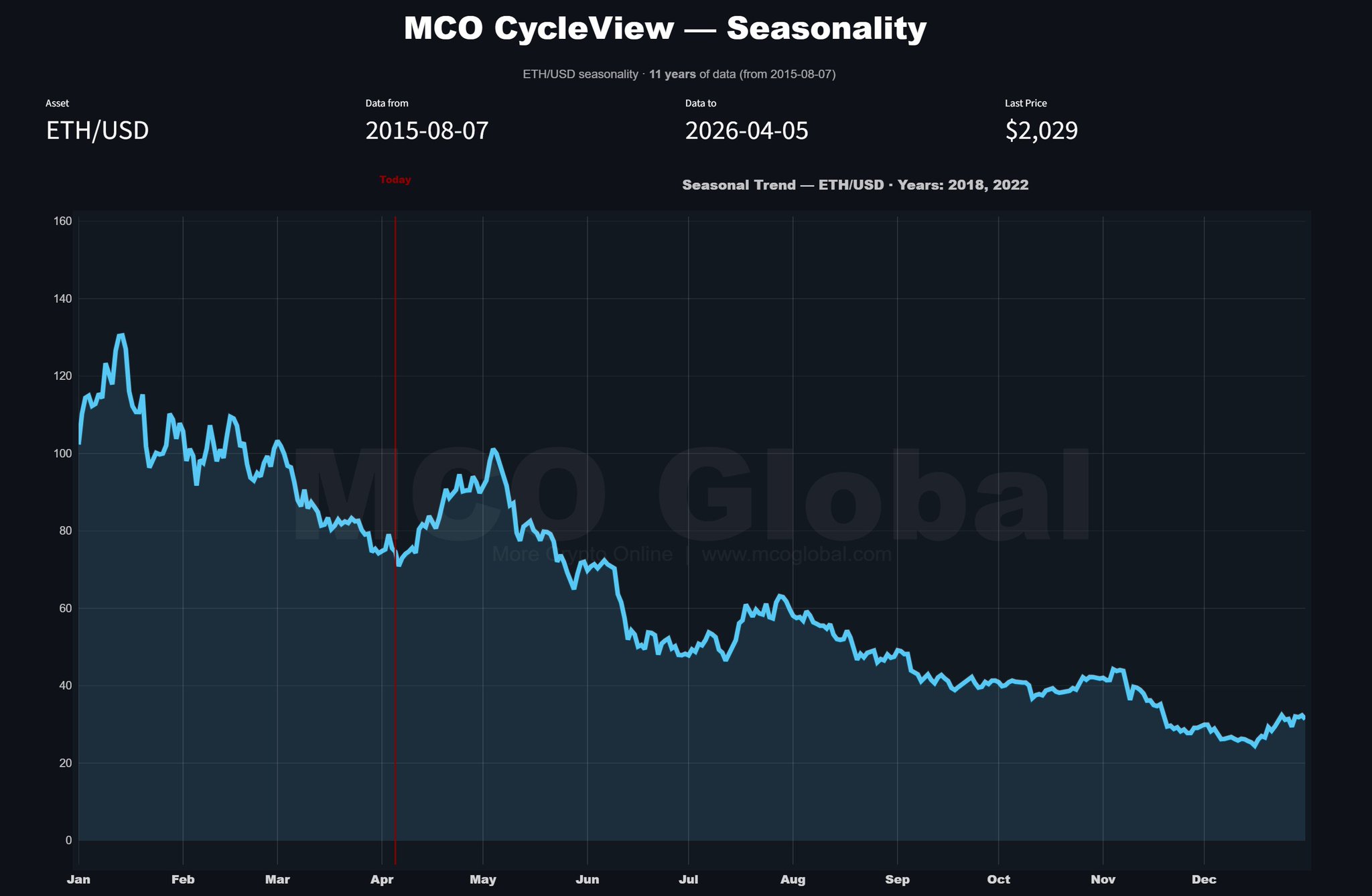 This chart highlights Ethereum’s seasonality specifically during bear market phases. Given how cyclical crypto markets are, it makes more sense to compare ETH across similar environments rather than across all available years. Since Ethereum has only gone through two major bear markets so far, the dataset is limited. However, focusing on 2018 and 2022 provides more relevant context than averaging across a broader period that includes fundamentally different market conditions.