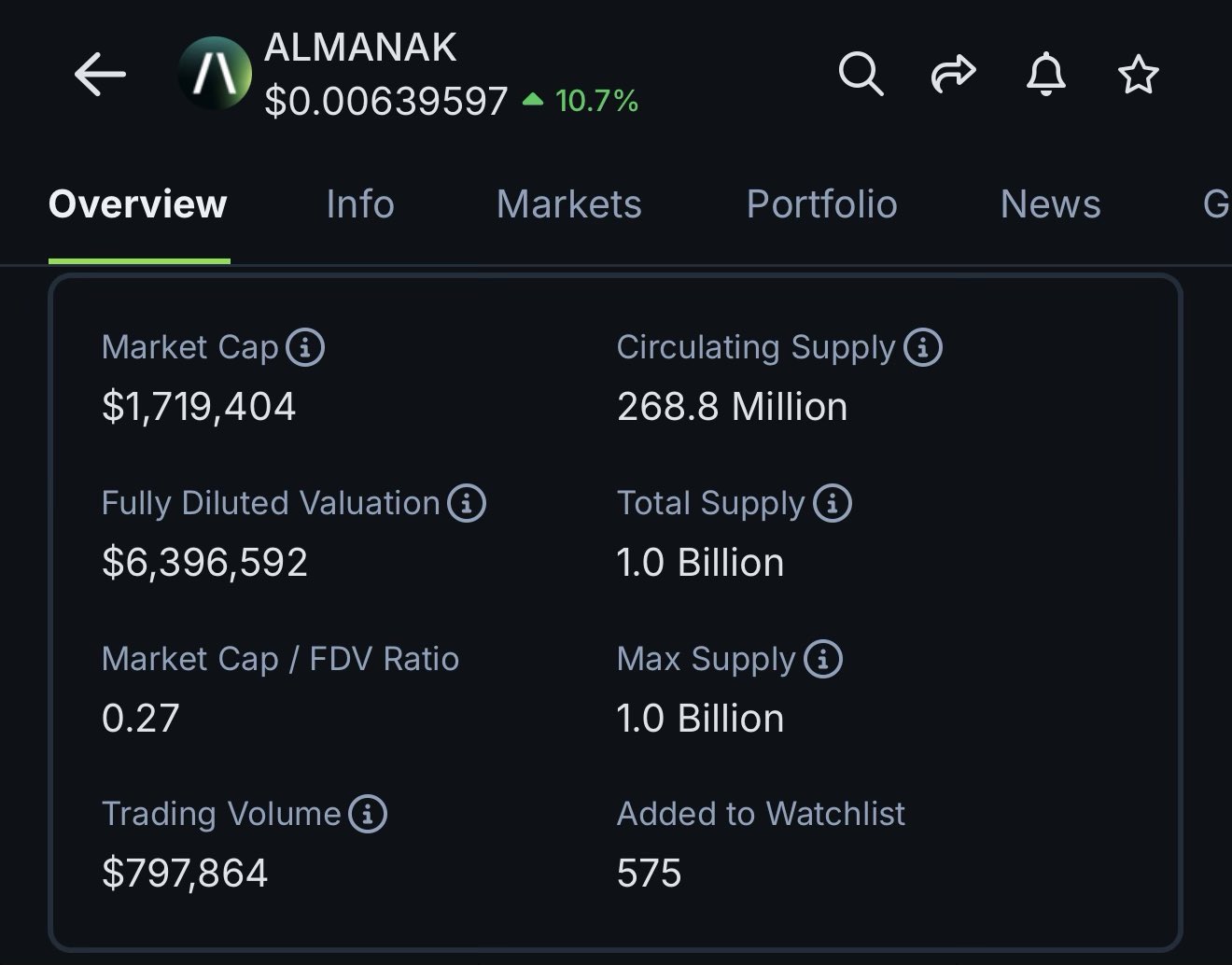 Almanak (ALMANAK) is a cryptocurrency launched in 2025and operates on the Ethereum platform. Almanak has a current supply of 1,000,000,000 with 0 in circulation. The last known price of Almanak is 0.00219996 USD and is up 0.83 over the last 24 hours. It is currently trading on 34 active market(s) with $248,393.54 traded over the last 24 hours. More information can be found at https://almanak.co/.