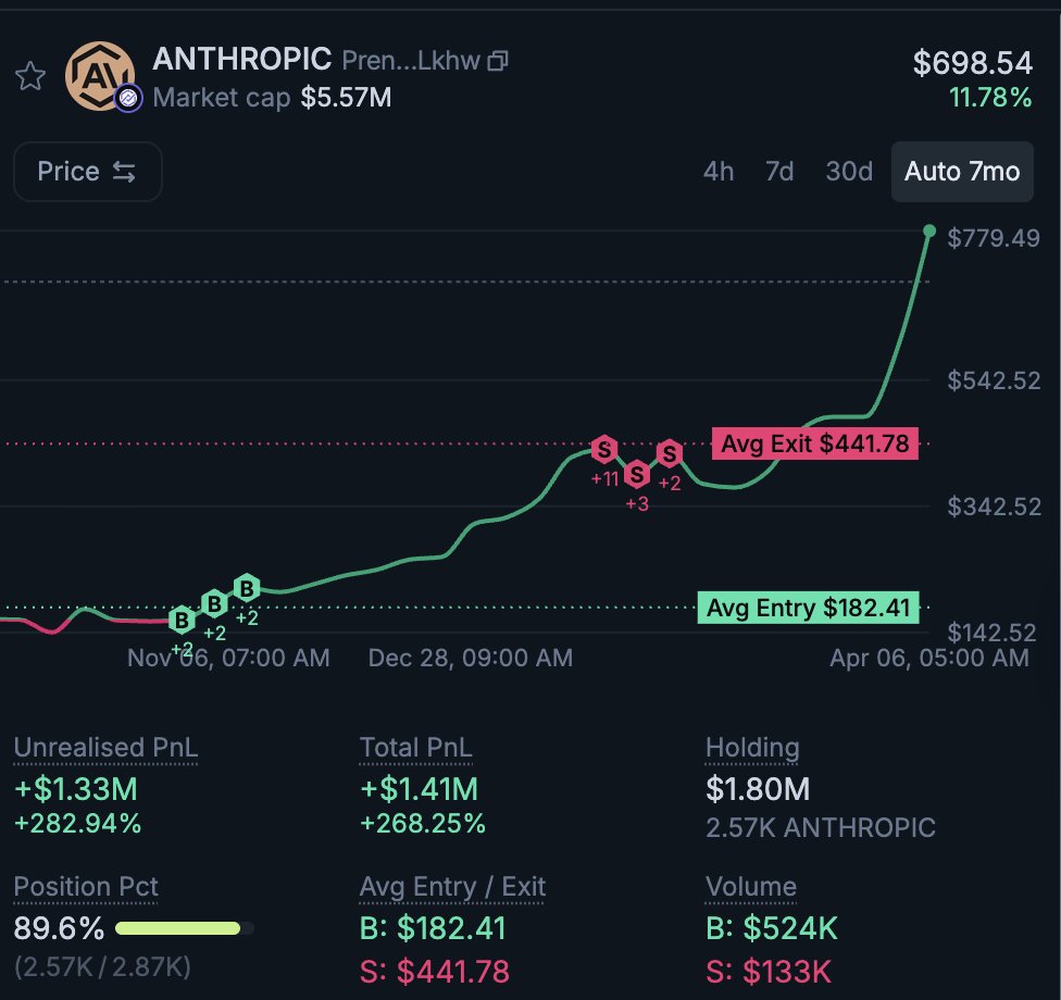 A trader's purchase of ANTHROPIC pre‑stocks on Solana surged in value, delivering a massive 268% return in five months.