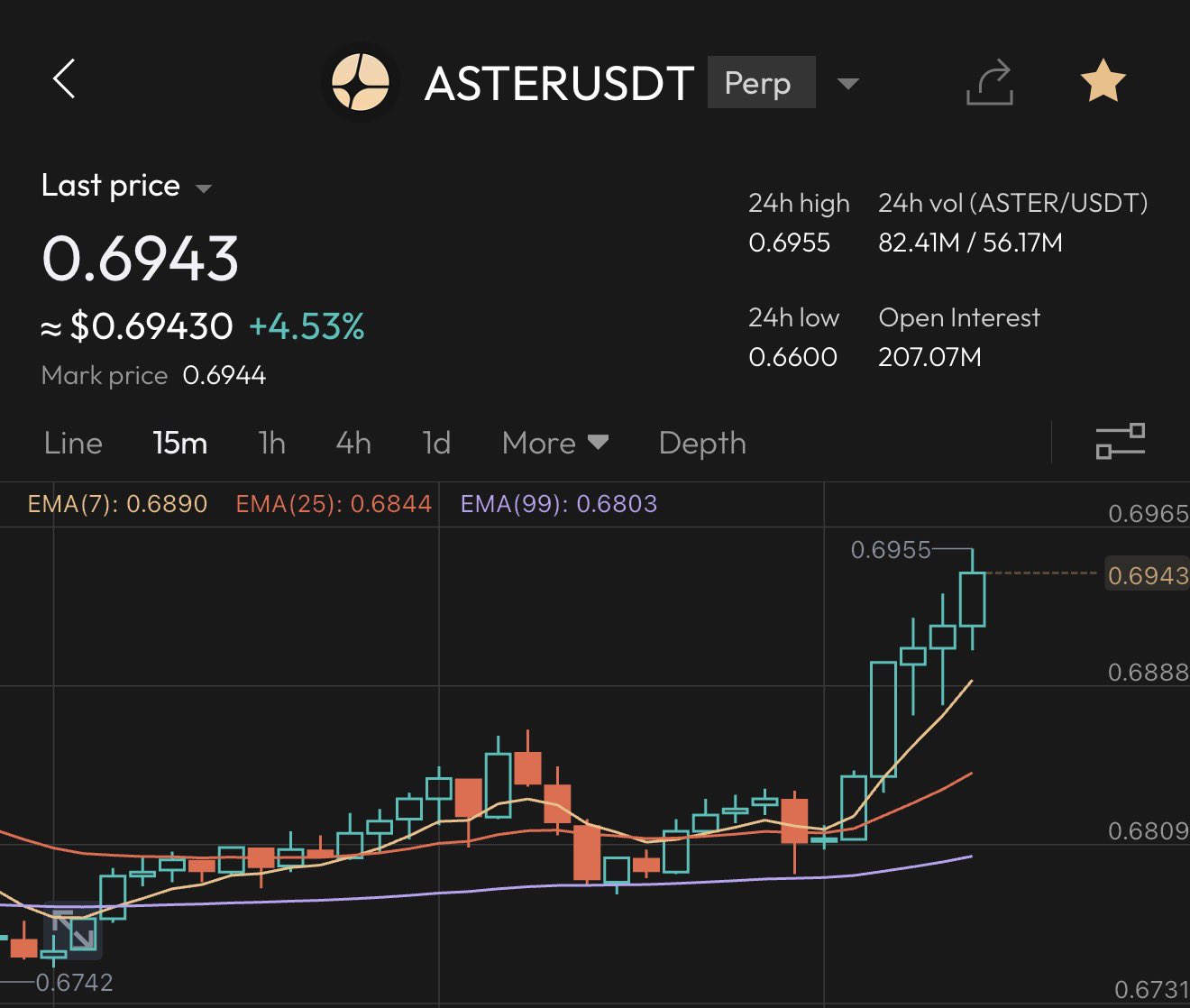 ASTER rose 4.53% to $0.6943, and the author is bullish, expecting it to reach $1 and plans to buy on dips.