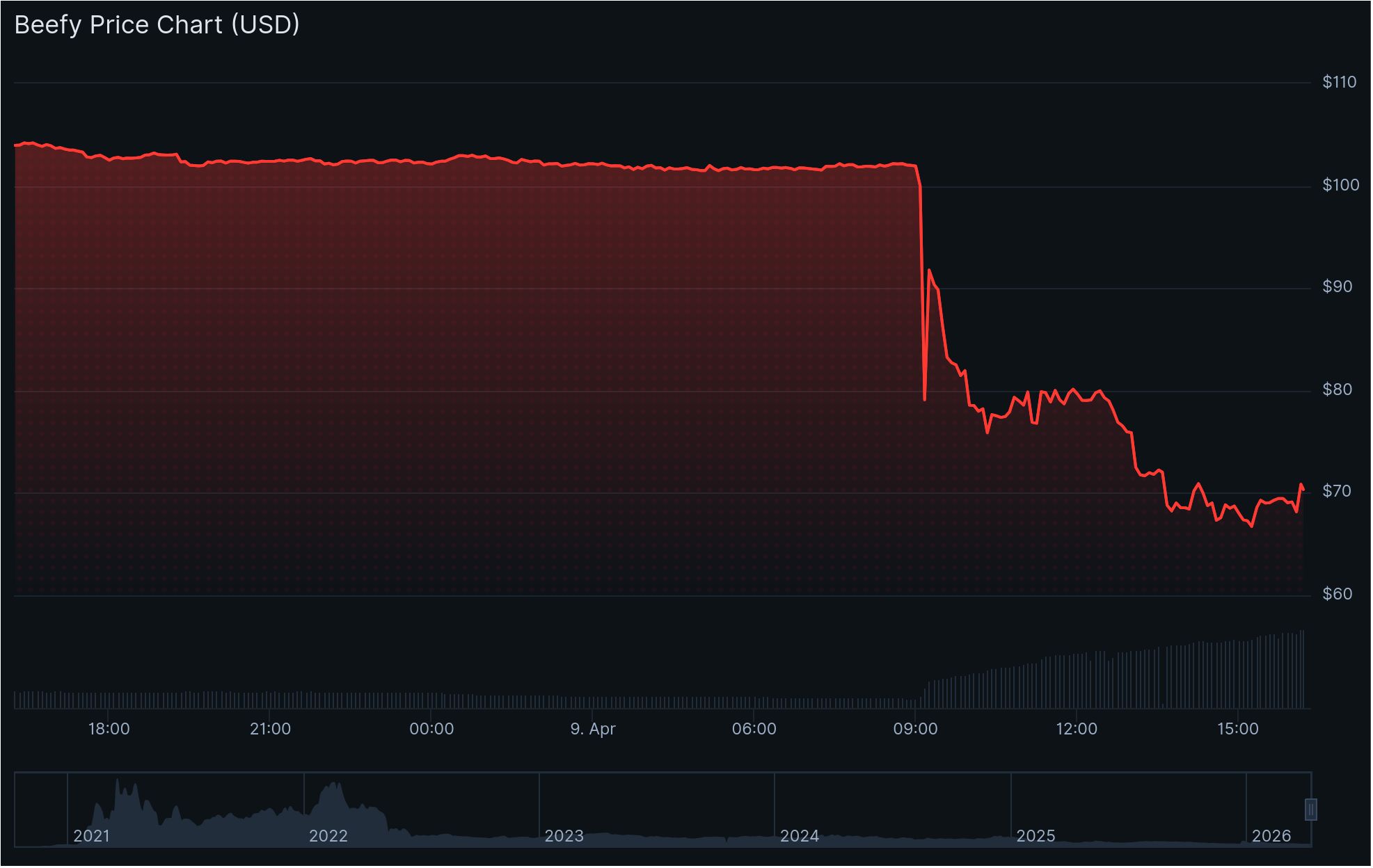 Today's price of Beefy Is $ 69.76 (BIFI/USD). With A Market Cap Of $ 5.58M USD. 24-Hour Trading Volume Of $ 781.30K USD, A 24-Hour Price Change Of -31.51%, And A Circulating Supply Of 80.00K BIFI.