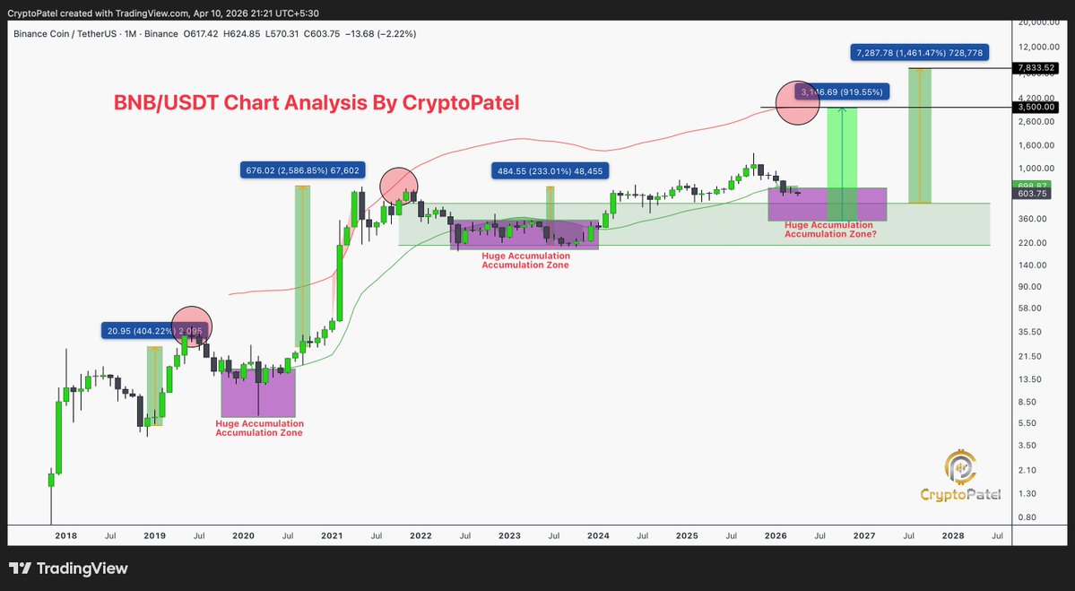 BNB is in a historic accumulation zone, suggesting a potential massive rally ahead, with a long‑term target up to $10,000.