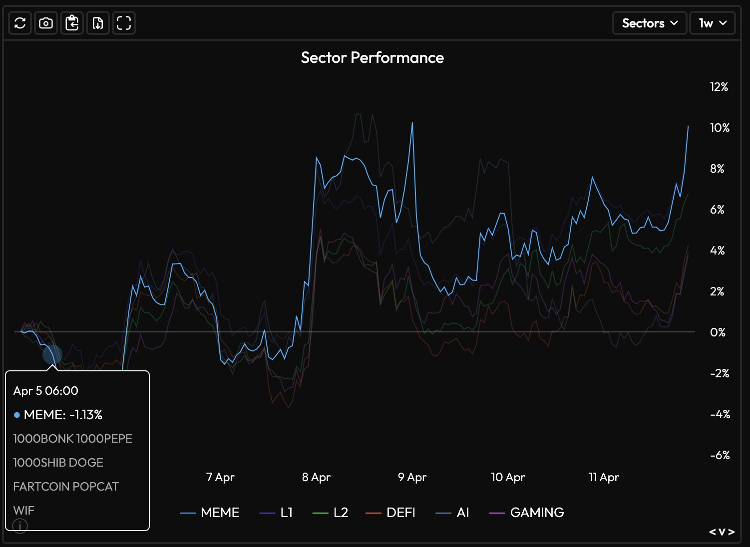 Altcoins have generally risen over the past week, with the meme coin sector performing the best and leading the gains.