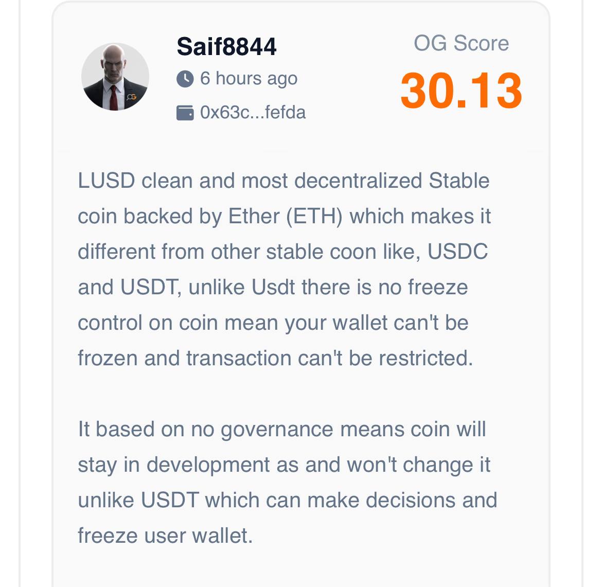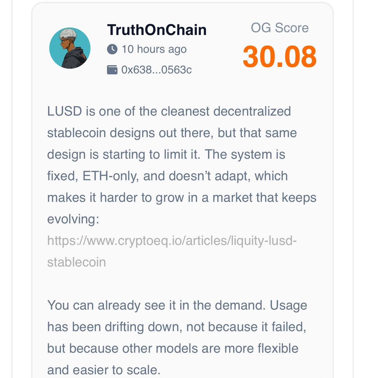 Our OG expert reviewers note that Liquity USD $LUSD stands out as a highly decentralized, ETH backed stablecoin with no governance or freeze risk but its rigid design limits scalability and adaptability.