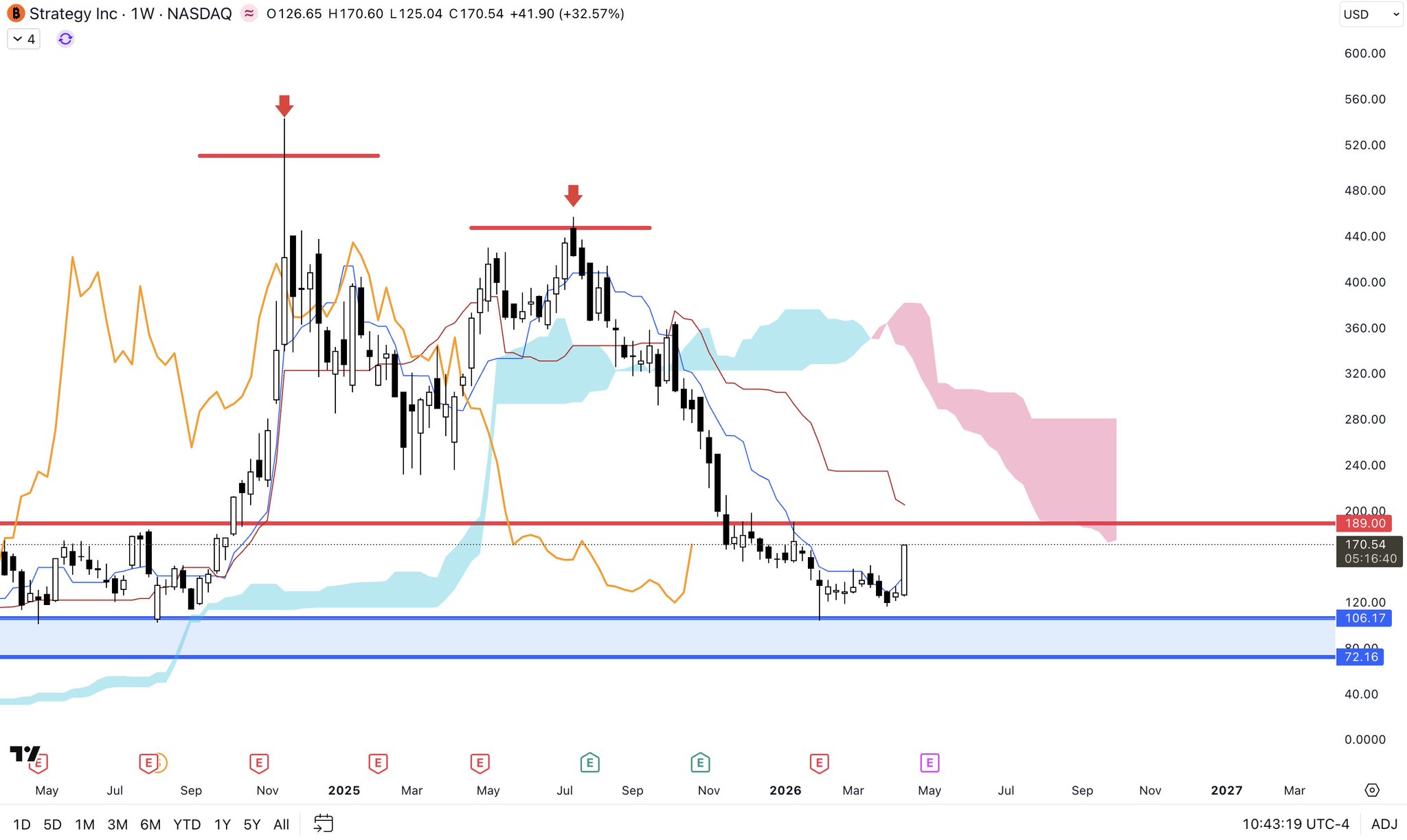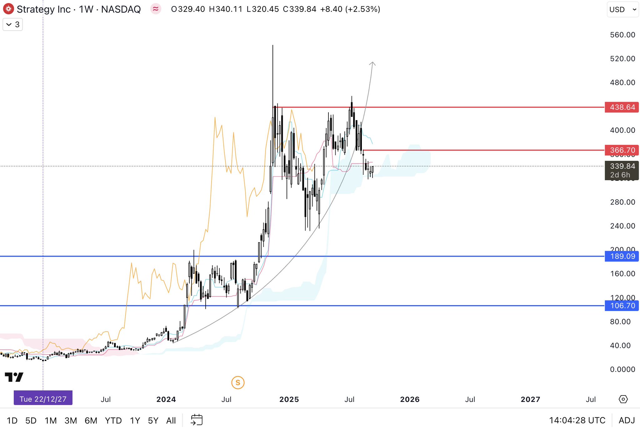 $MSTR Following the natural path here. As expected the Kumo is offering some support but you can see the Tenkan curling down already telling us the downward momentum is strong. Might have a dead cat with a resistance at 366 which is the top of a LTF WP Range. Break that and this will morph from full bearish, to chop or sideways. Otherwise, nothing to look for.