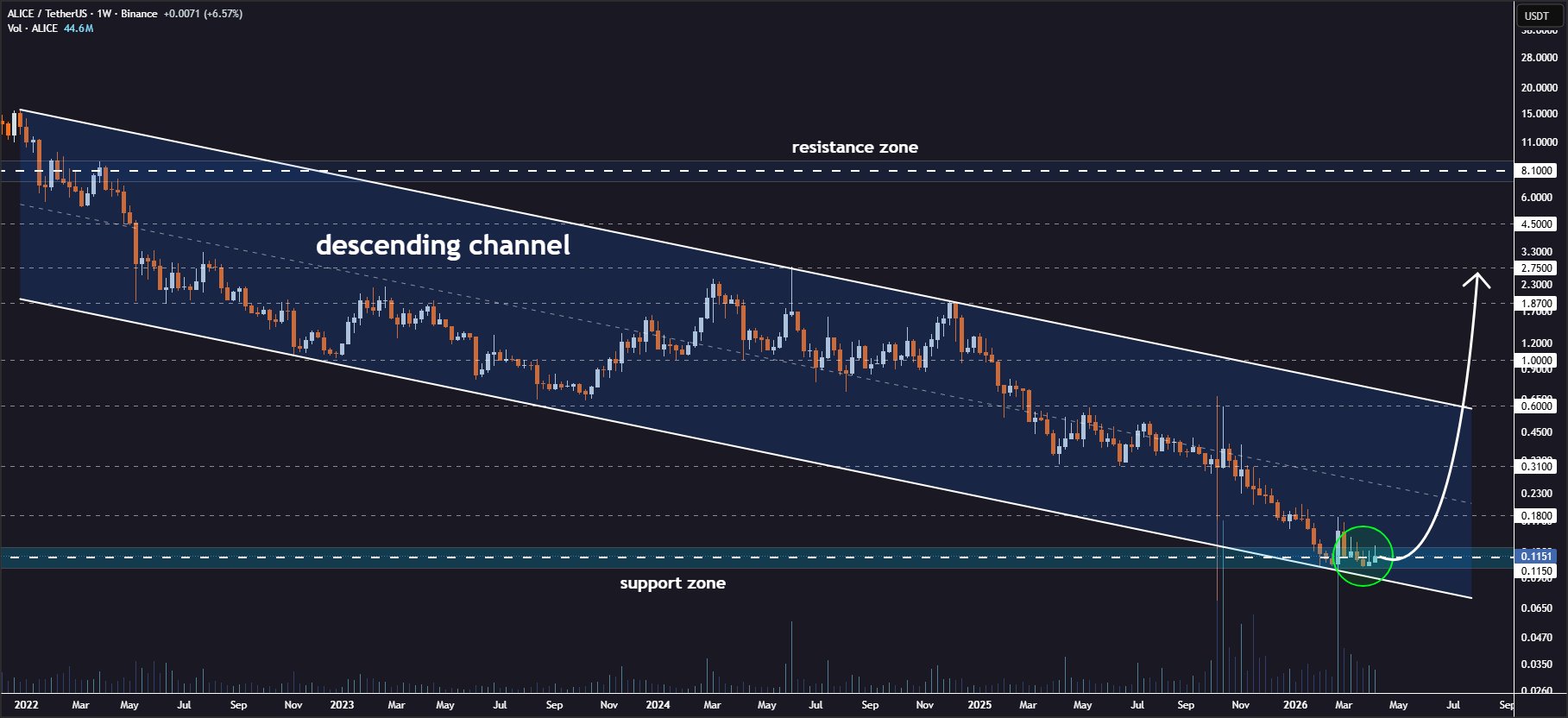 ALICE rebounds at the bottom of a descending channel and support area, with increasing volume, indicating strong recovery potential.