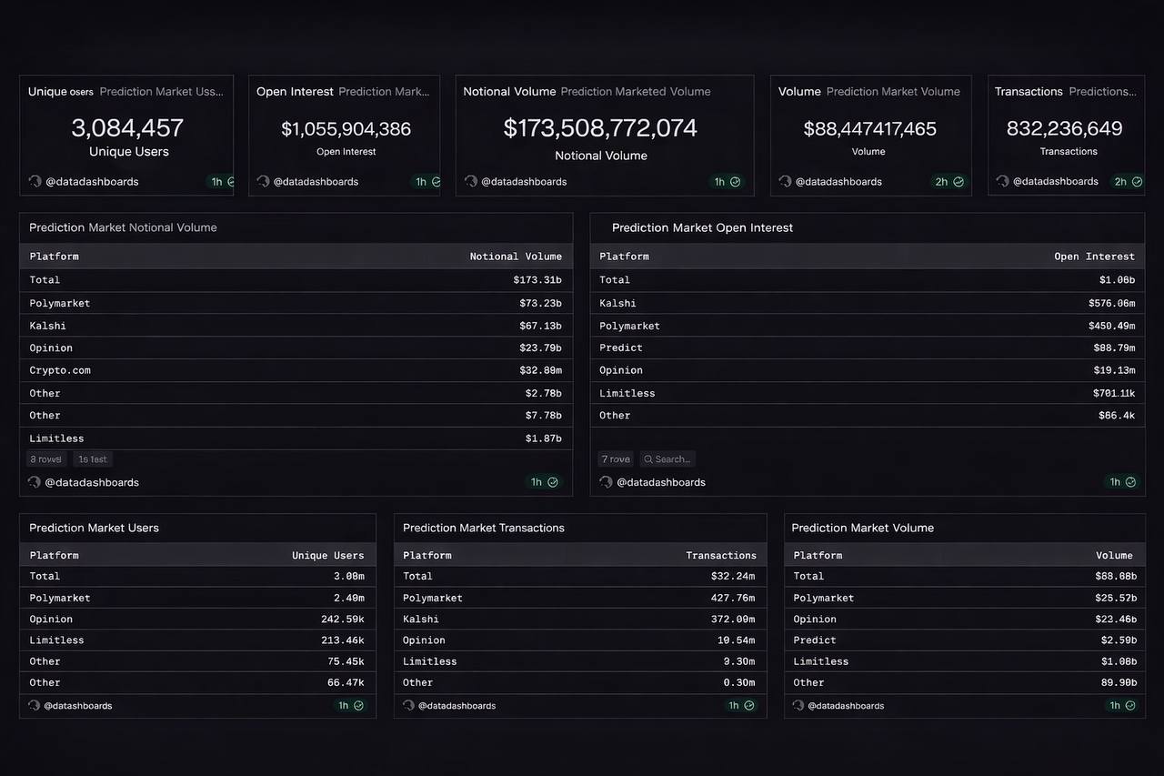 🔢⛓️ \nPrediction market has been attracting serious interest lately.\n\nWhat do the overall metrics look? \nWhich projects are standing out? \nWhich projects have listed tokens?\n\nLet's examine together. \n\nDon't forget to like & RT. :)\n\nFirst, let's look at the overall metrics:\n\n- User count: 3 million \n- Total transactions: 832,236,659 \n- Hypothetical volume: $173 billion \n- Total volume: $88 billion \n- Open positions: $1 billion \n\nThe key metrics here are:\nopen positions and user count.\n\nNow let's look at the standout projects:\n\n⚡️ Polymarket:\n- User count: 2.5 million \n- Total transactions: 427 million \n- Total volume: $58 billion \n- Open positions: $450 million \n\nPolymarket leads in all metrics except open positions.\n\nIt raised $2.87 billion at a $9 billion valuation.\n\n⚡️ Kalshi:\n- Total transactions: 372 million \n- Open positions: $576 million \n\nKalshi leads in open positions.\nIt raised $2.56 billion at a $22 billion valuation.\n\n⚡️ Opinion:\n- Hypothetical volume: