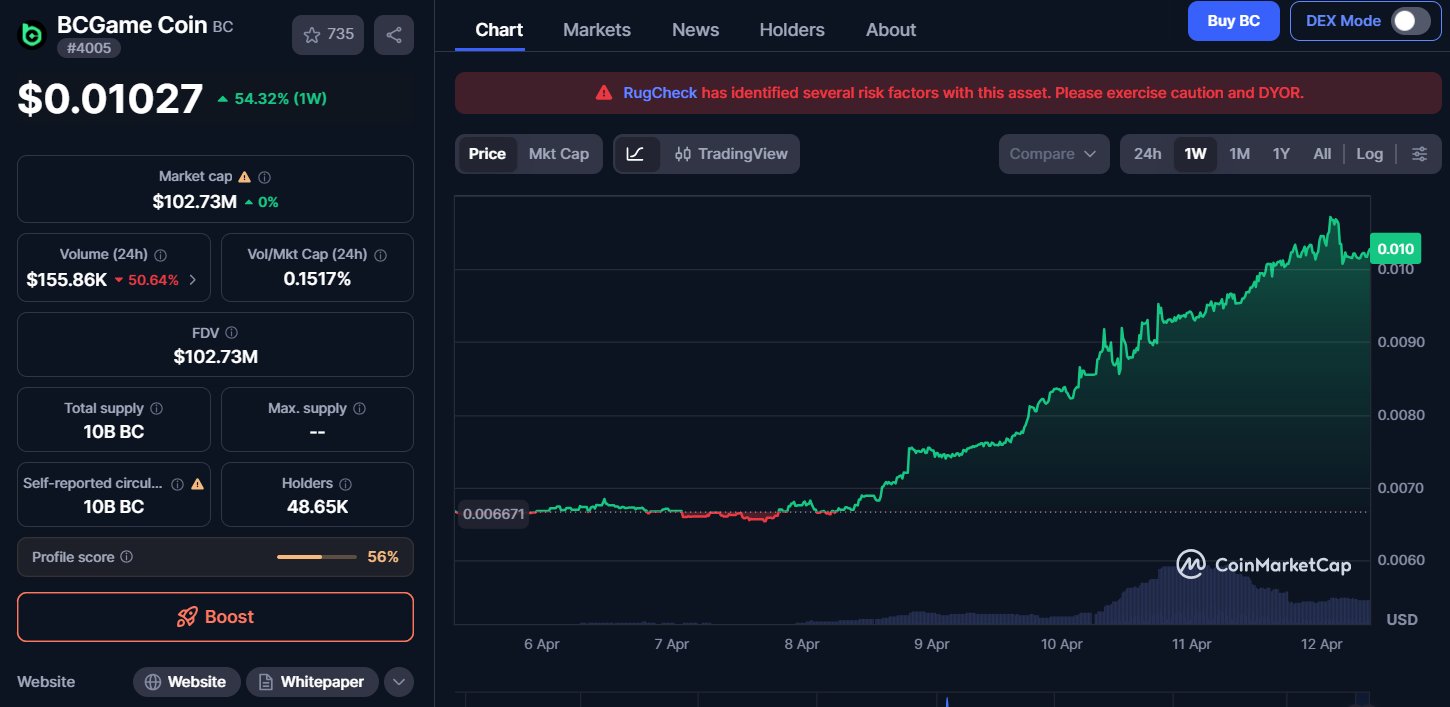BC breaks 1 cent, up over 54% in a week, but carries a high-risk warning.