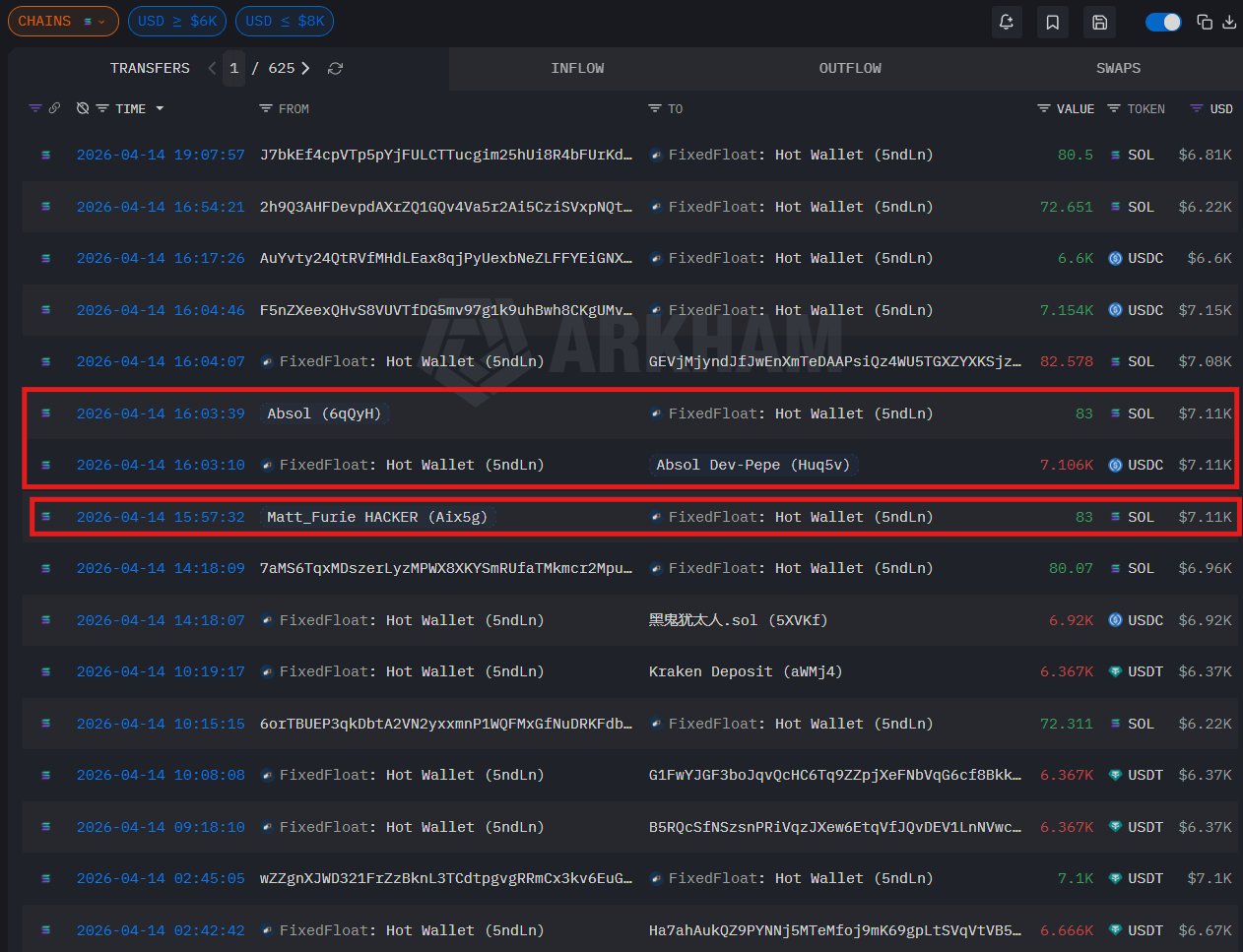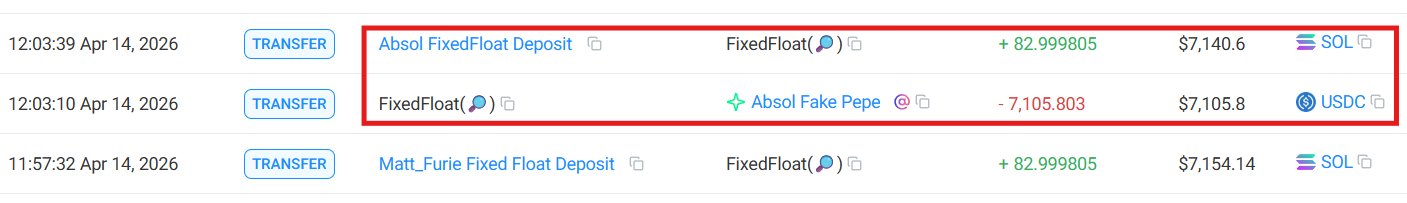 He spotted the Matt Furie hacker bridged $7.11k on FixedFloat, so he mirrored the exact same amount to create a fake transfer to a new Solana wallet.