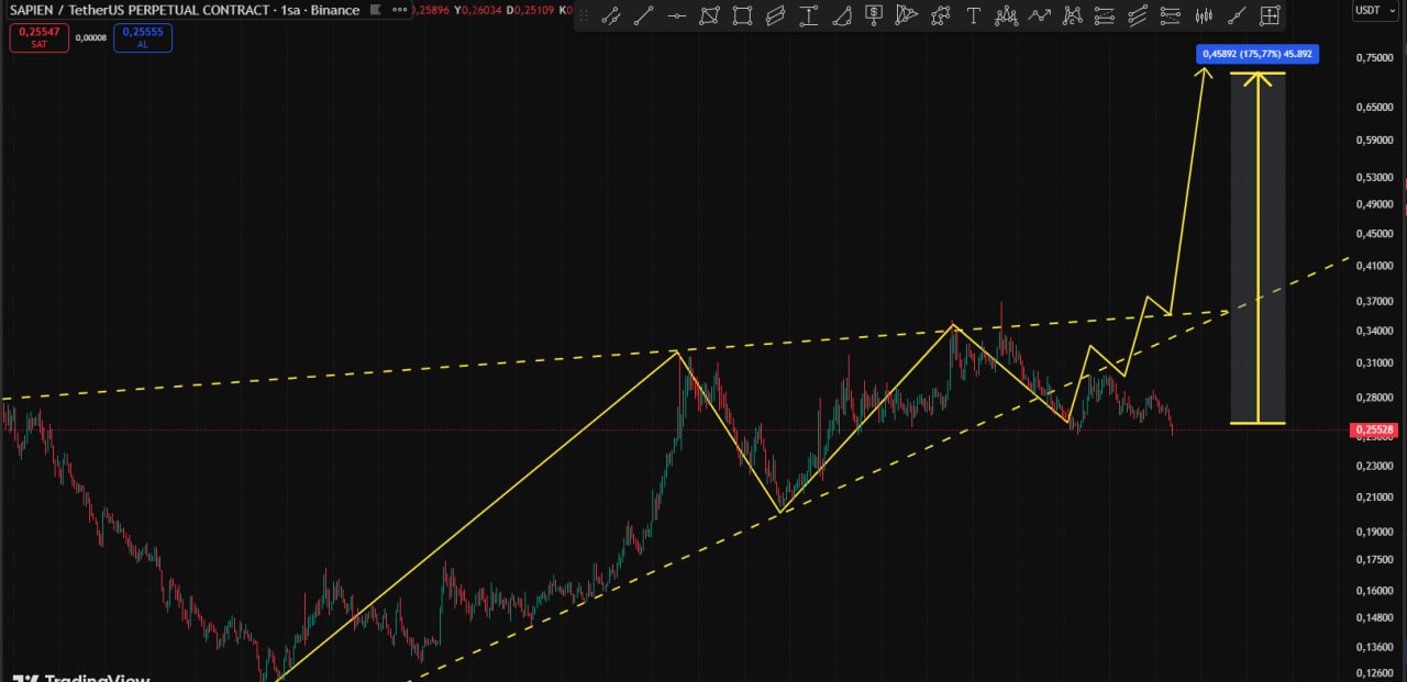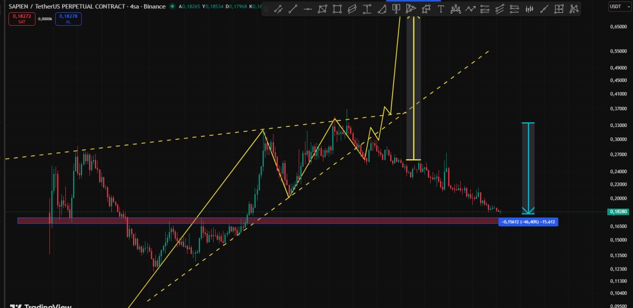 After the #SAPIEN price dropped from $0.33 to $0.18, the tweet suggests buying the dip in the $0.15-$0.175 range to acquire more quantity.