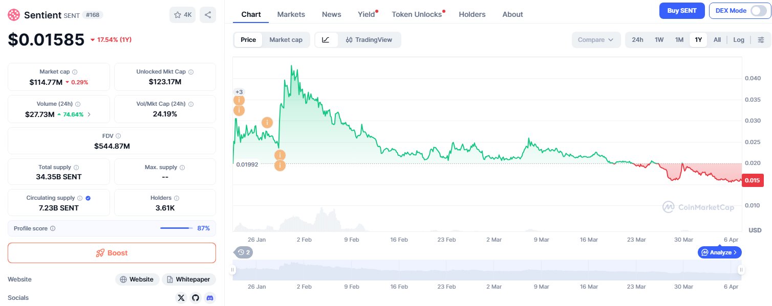 SENT price continues to fall, the author believes it will be hard to reach the expected market cap.