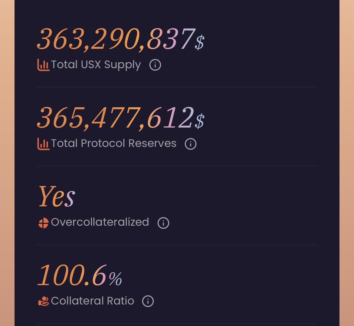 Proving that USX is overcollateralized at 100.6% with reserves of $365.5M against the $363.3M supply