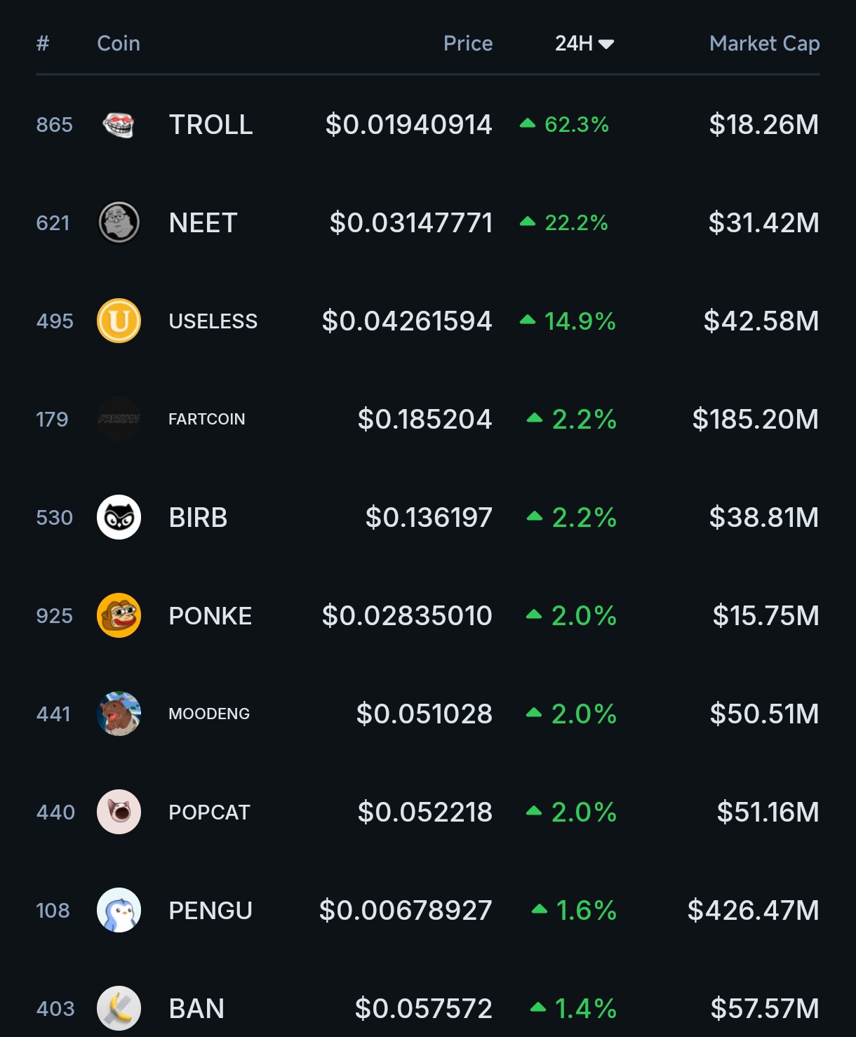 TROLL token had the largest 24‑hour gain among Solana meme coins, reaching 62.3%.