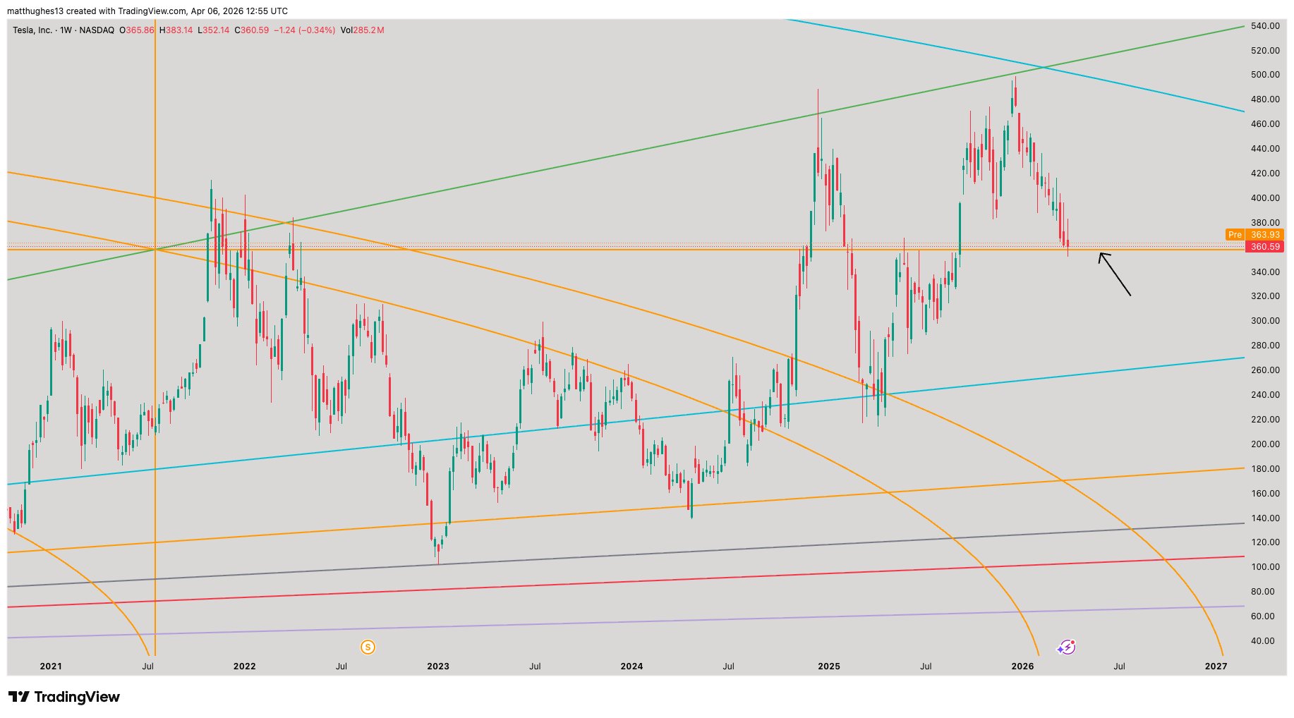 The author is bullish on TSLA at the $350‑$360 support level, stating the risk/reward ratio is excellent.