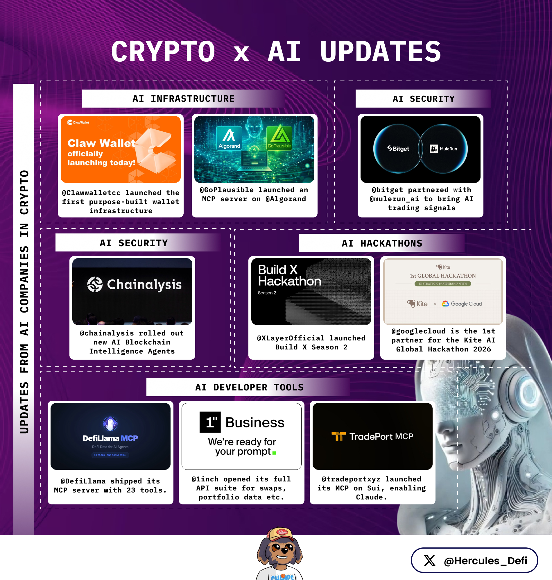 Hercules | DeFi DeFi_Expert Educator C46.93K @Hercules_DefiYour next onchain counterparty might not be human. AI agents are swapping, signing, funding, and transacting autonomously, 24/7, at machine speed. These are some huge updates you might have missed 🧵 --------------------- ➢ @linuxfoundation announced it is launching the x402 Foundation with the contribution of the x402 protocol from Coinbase. --------------------- ➢ @Clawwalletcc launched the first purpose-built wallet infrastructure designed specifically for autonomous AI agents, with on-chain asset shielding, DeFi security, and partnerships including PIN AI, 0G Labs, and Navi Protocol. --------------------- ➢ @chainalysis rolled out new AI Blockchain Intelligence Agents that automate investigations and compliance using natural language, integrating directly with their on-chain data stack for law enforcement and institutions. --------------------- ➢ @GoKiteAI announced @googlecloud as the first strategic partner for the Kite AI Global Hackathon 2026, powering builders to create agents that discover, neg