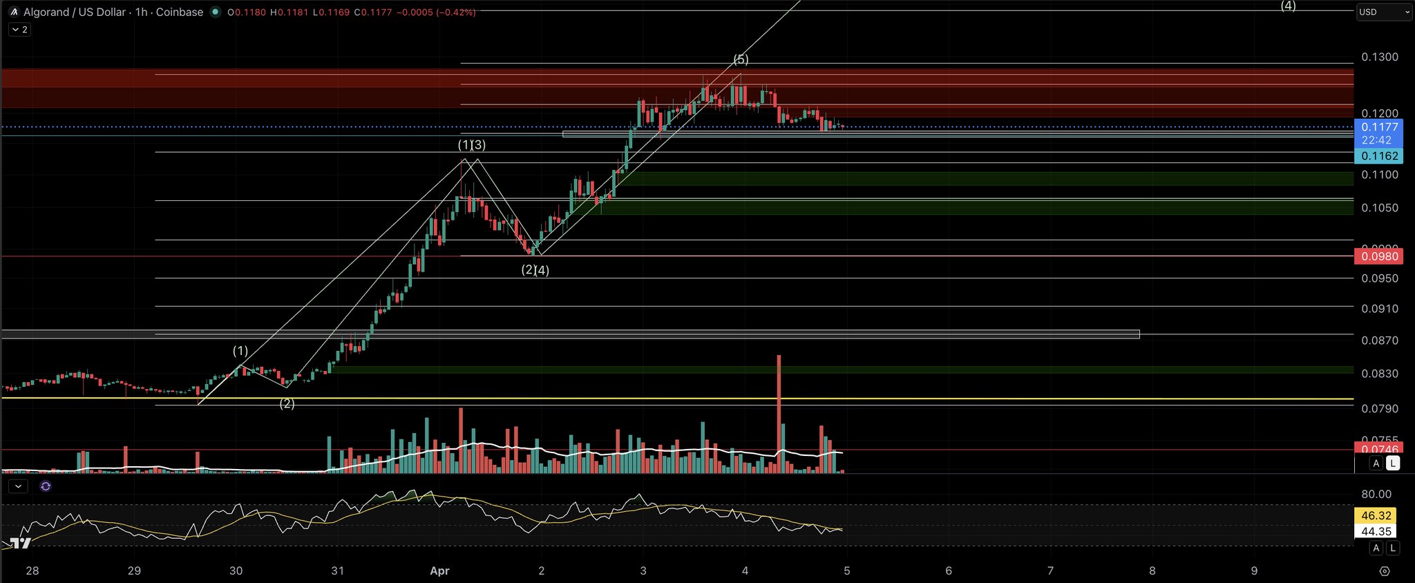 Eric Van Tassel (Not a Financial Advisor!) TA_Analyst Trader A6.52K @XRPathologistWatching how #ALGO reacts relative to #BTC here. Bitcoin is compressing and looks primed for a move down into the macro trend rail late this weekend or early next week. So the question is timing: Does Algorand keep showing relative strength, push into a wave 3 top this weekend, then roll over in wave 4 with BTC? Or does it stall here, lose support, and sync lower sooner? Leaning slightly toward one more push higher first… but that green zone is key.