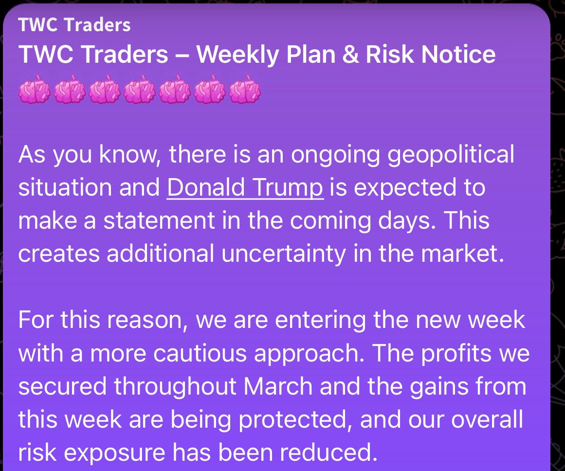 LSTRADER TA_Analyst Trader A35.11K @LSTraderCryptoLSTRADER - Weekly Plan & Risk Notice 🧠 As you know, there is an ongoing geopolitical situation and Donald Trump is expected to make a statement in the coming days. This creates additional uncertainty in the market. For this reason, we are entering the new week with a more cautious approach. The profits we secured throughout March and the gains from this week are being protected, and our overall risk exposure has been reduced. #CryptoTrading